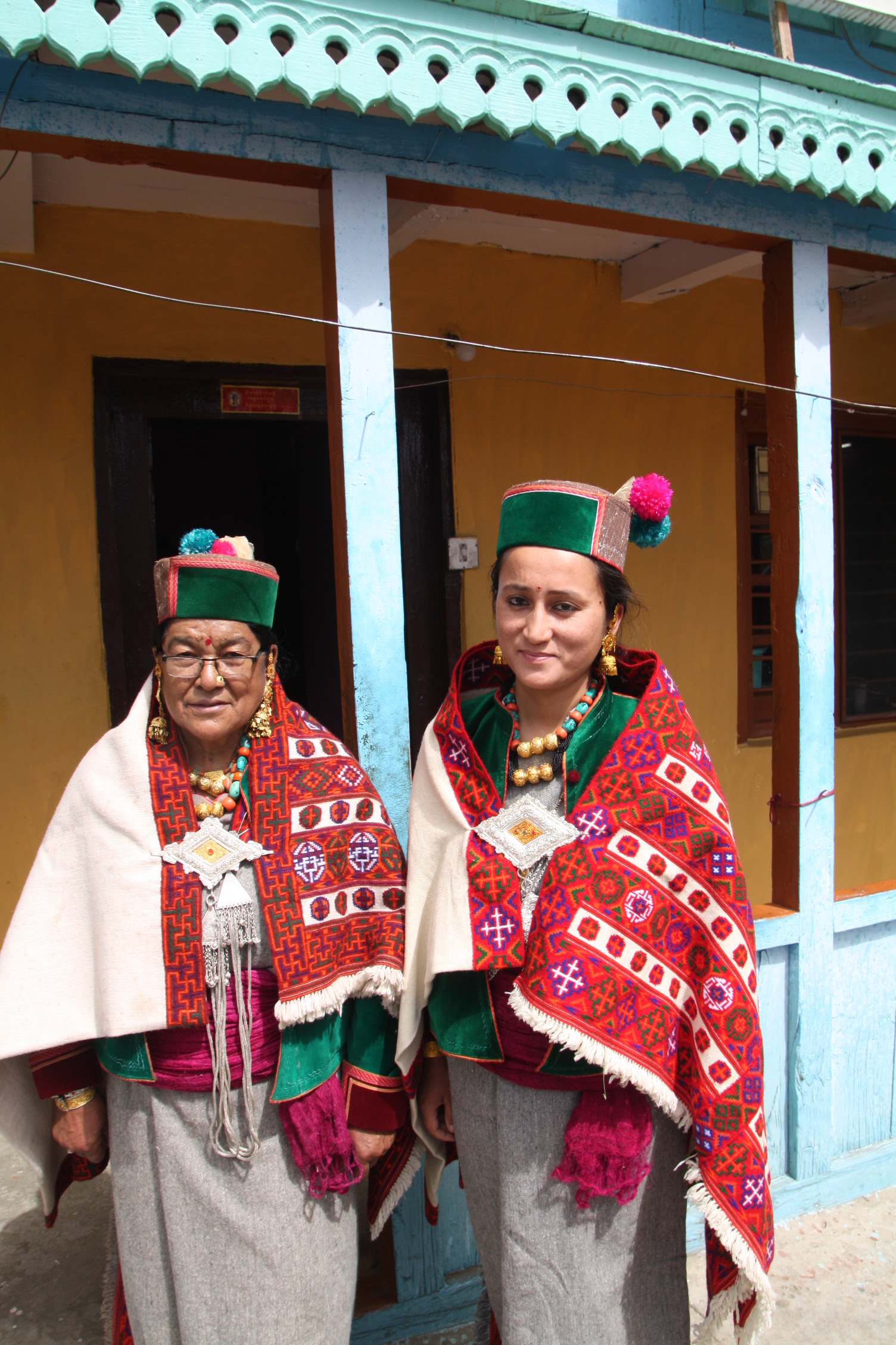 Kinnauri nők hagyományos ruhában az indiai Himachal Pradeshben