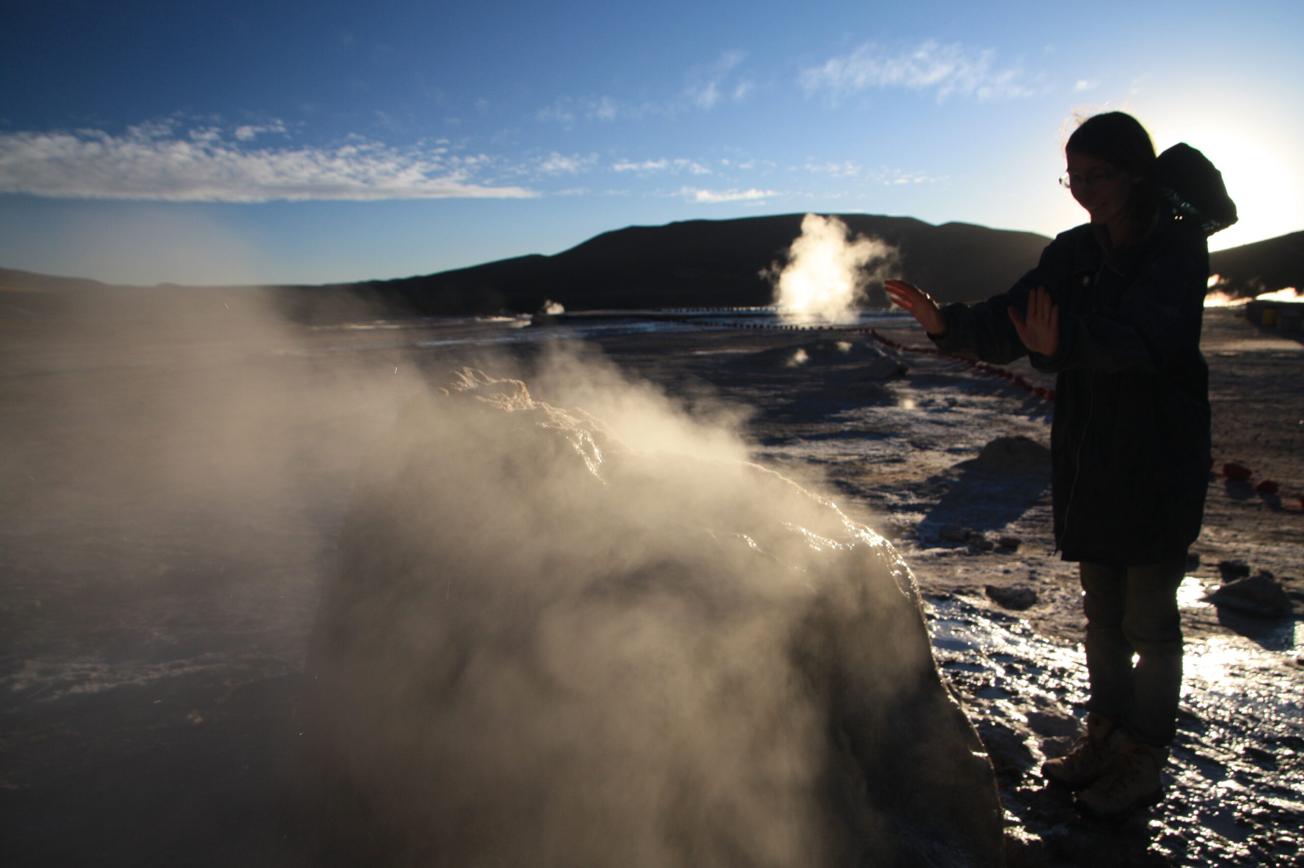 Próbálom felmelegíteni a kezeimet a Tatio geotermikus területen, 4320 méteren, Chilében