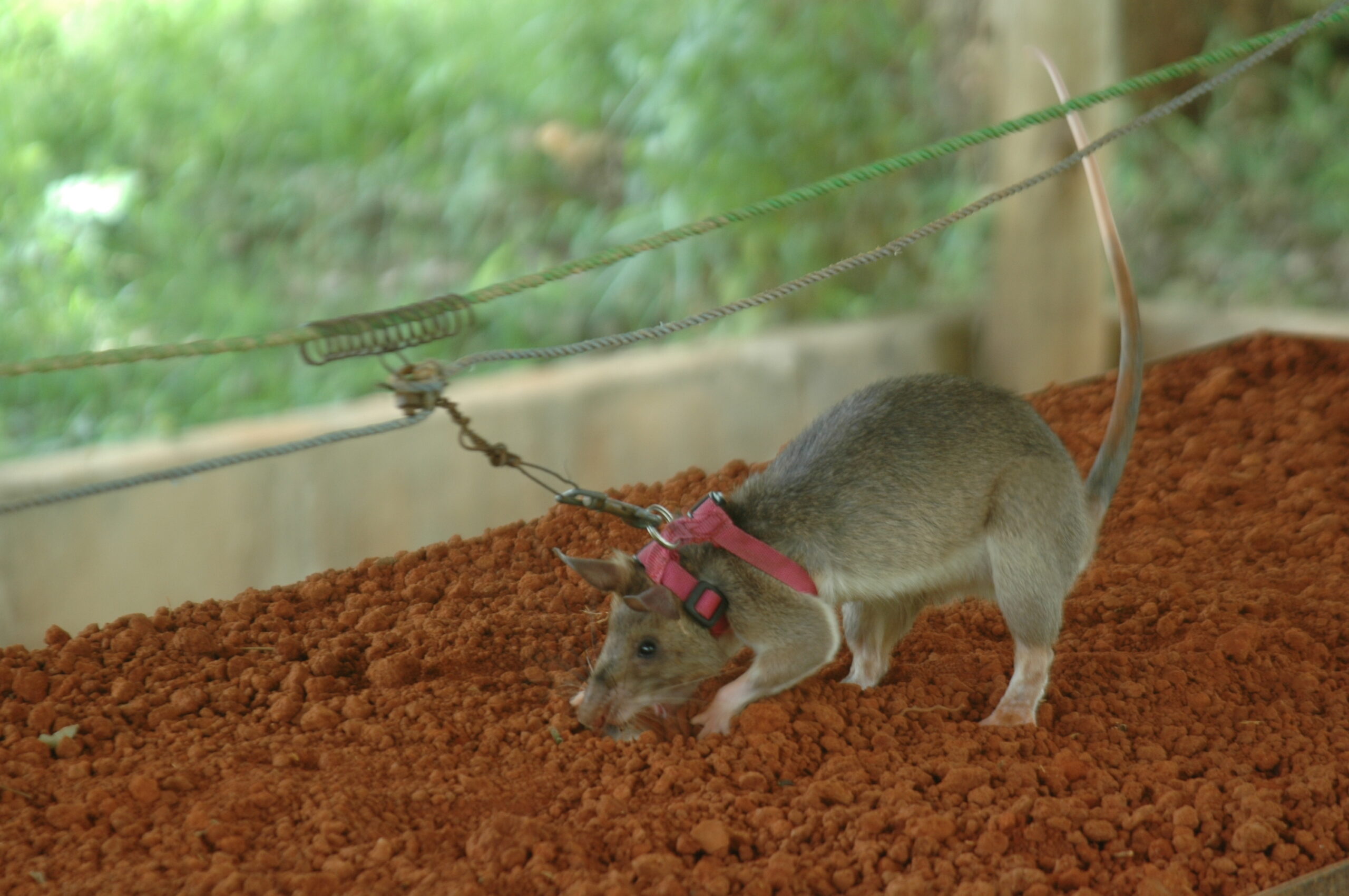 Egy óriás erszényes patkány, amit taposóaknák felderítésére képeznek ki Tanzániában